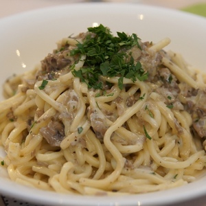 Remove from the heat and add white truffle cream and stir sauce. Add the parsley.
