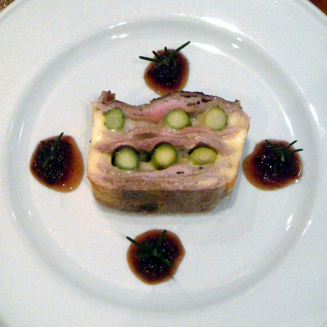 Stuff pork, mozzarella, parmigiano, green asparagus into terrine pan.