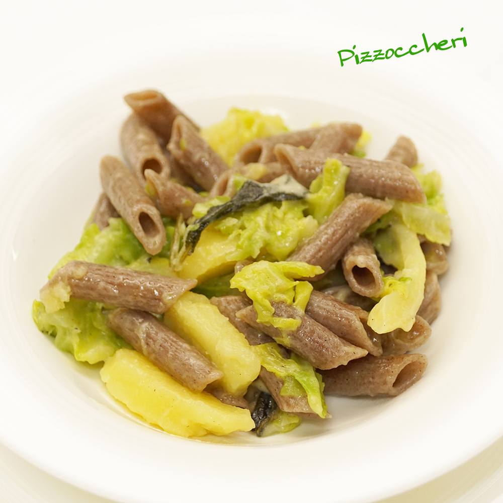 Cook ingredients with boiled water in the same pot starting from pasta, potato, and cabbage by each cooking time.